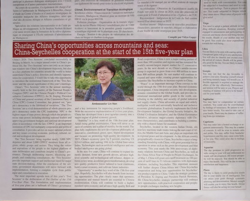 2026年4月9日,驻塞舌尔大使林楠在塞《民族报》发表署名文章《跨越山海 携手同行:中塞在“十五五”起点上的合作共赢》。文章全文如下: